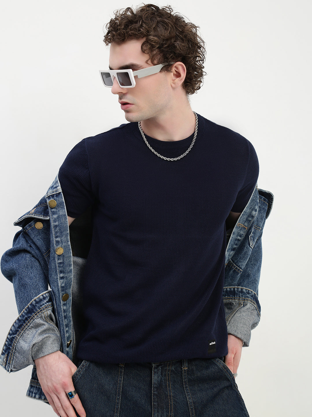 Crew Neck See Through Navy Blue Cotton T-Shirt